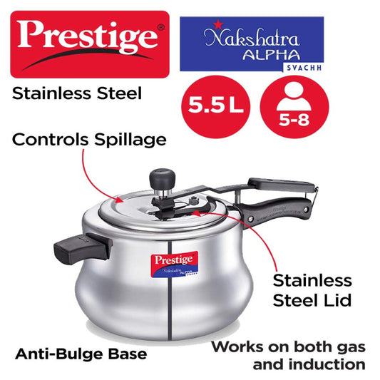 Prestige Svachh Nakshatra Alpha Stainless Steel 5.5 Liter Handi Pressure Cooker, Silver - 20258