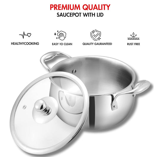 Vinod Platinum Triply Stainless Steel Medium Belly Saucepot With Glass Lid 2 Liter | Induction Base, Silver - PSOM16