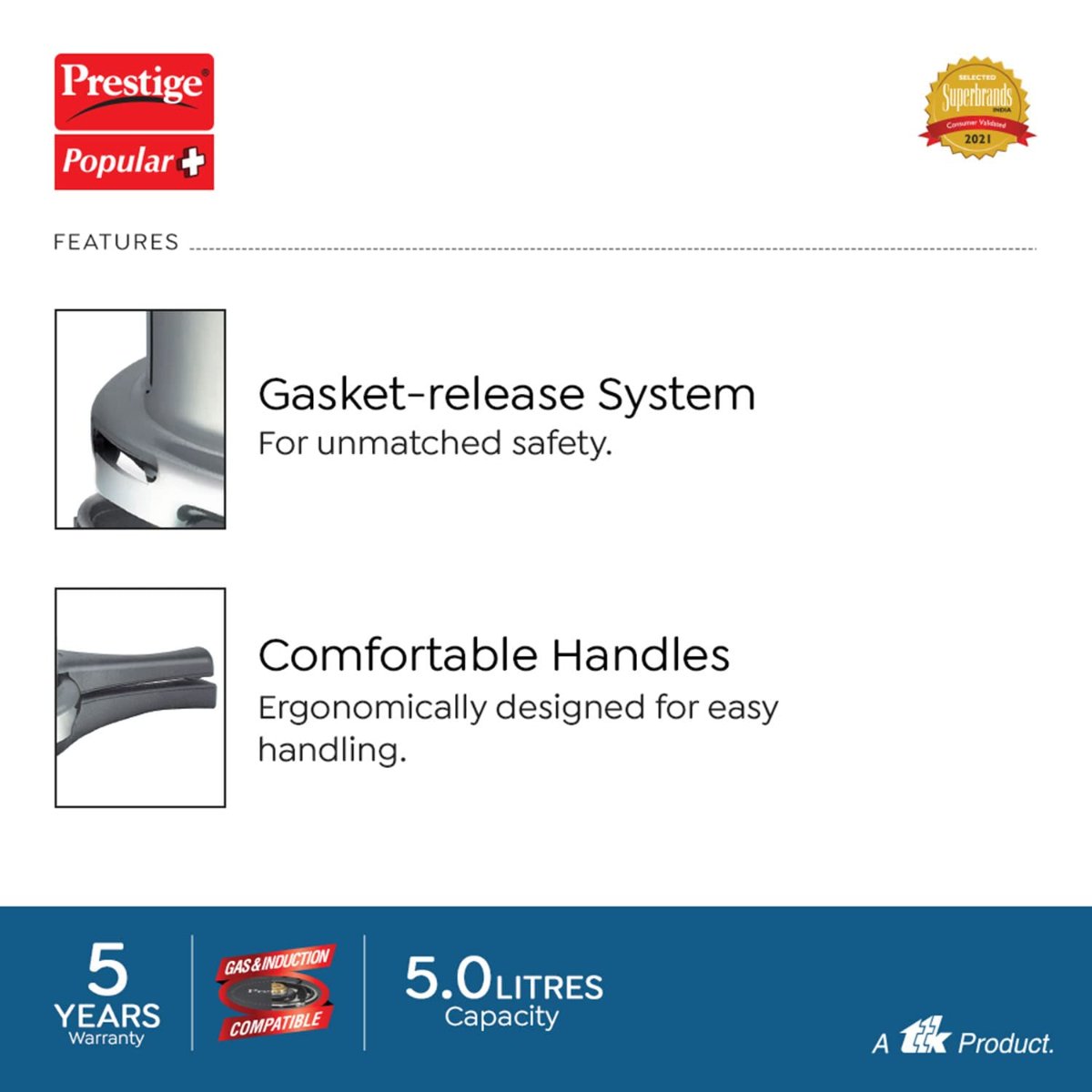 The Prestige Popular Plus Virgin Aluminium Outer Lid 5 Liter Pressure Cooker is designed for versatility and efficiency in the kitchen.
