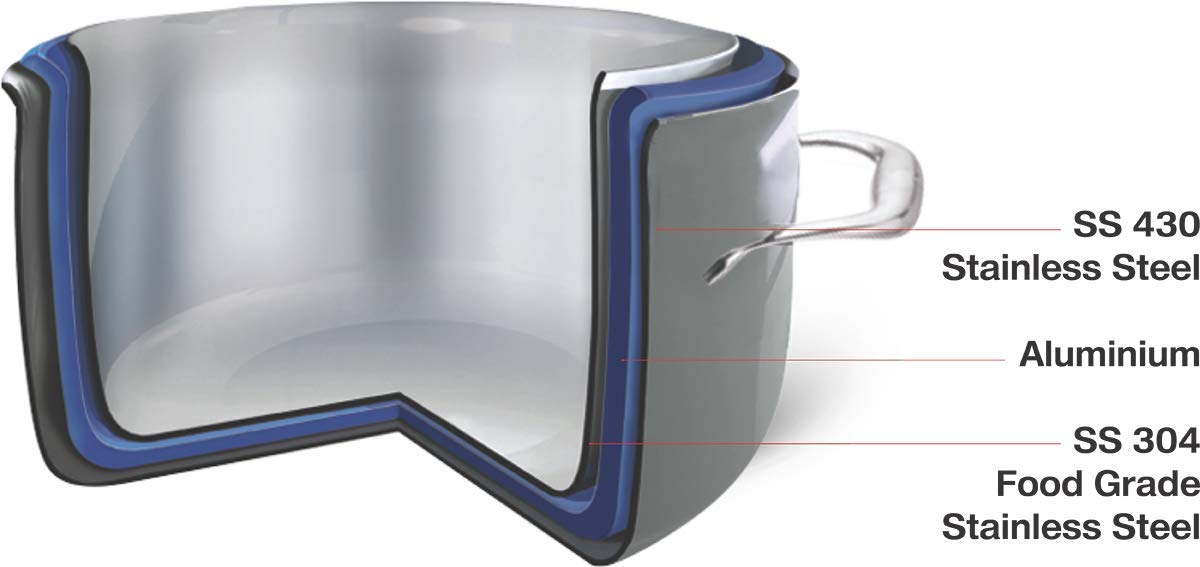 Vinod Platinum triply stainless steel series is made up with SAS technology, which is a triple layer construction of stainless steel, aluminium and stainless. The inner layer is made up of food grade 18/8 stainless steel, which is hygienic stainless steel and rust free. The middle layer is consists of aluminium throughout, this ensures in even heat distribution and uniform cooking of food. The third layer is made of 430 stainless steel for induction compatibility.