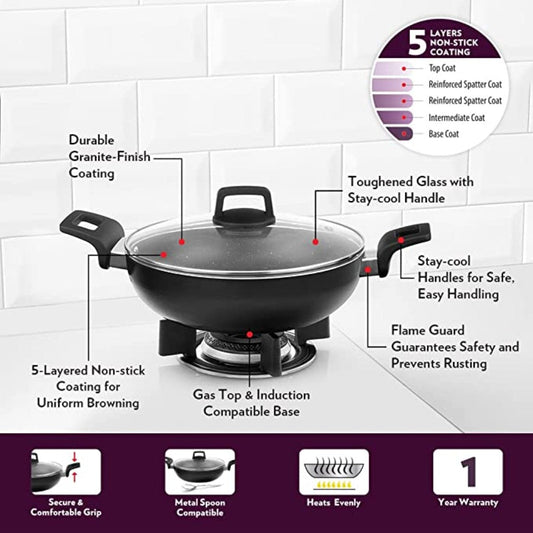 Borosil Granito Nonstick Kadhai With Glass Lid