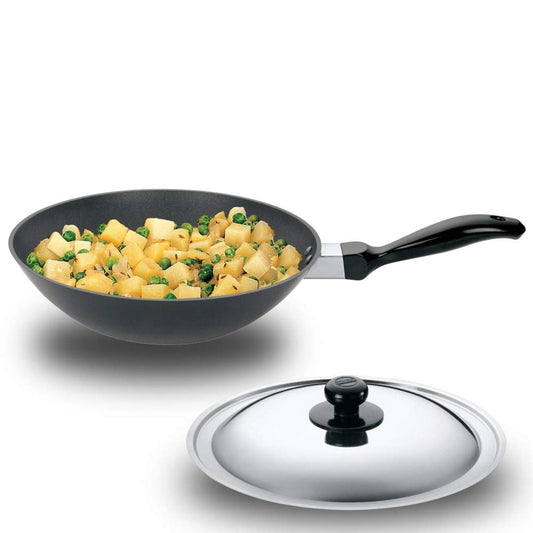 Futura Nonstick Deep Wok Pan (Round Bottom) With SS Lid by Hawkins